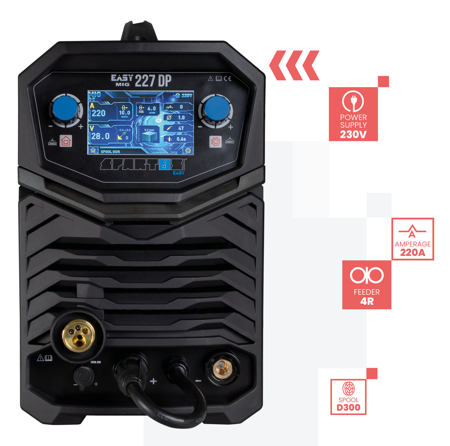 SPARTUS EasyMIG 227DP is a universal, modern 230 V MIG/MAG welder with double pulse, combining precision, efficiency, and ease of use.